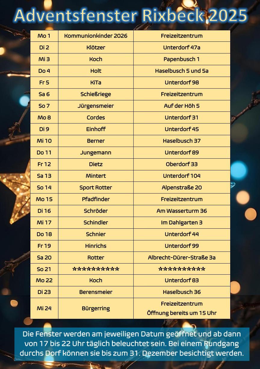 Viel Spaß beim Öffnen und bestaunen der Adventsfenster und eine schöne Adventszeit.